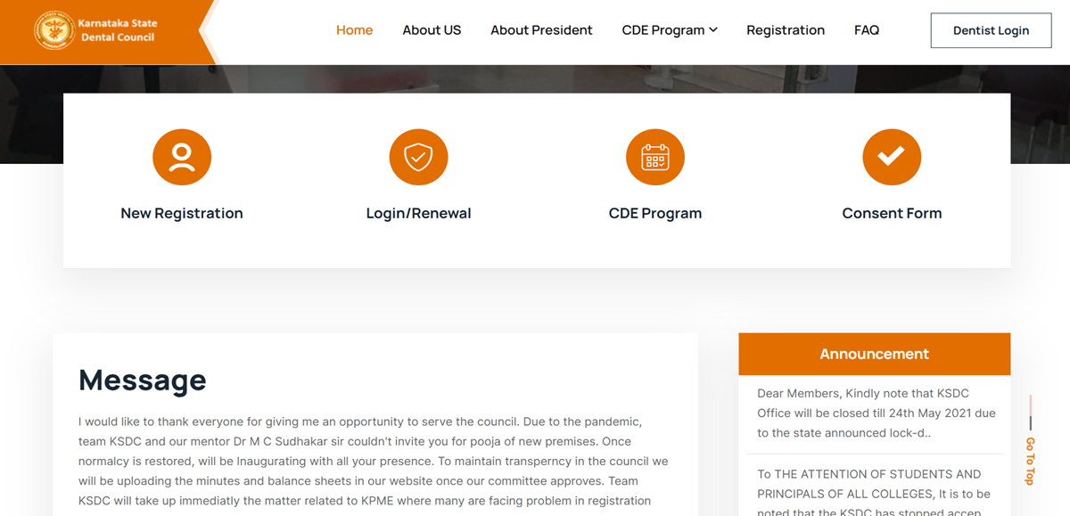 The development of the website for the Karnataka State Dental Council represents a pivotal step towards modernizing registration processes and improving accessibility to crucial information for dental professionals and stakeholders. The website offers a user-friendly interface, allowing seamless registration through an online portal and providing comprehensive resources such as registration guidelines, application forms, and program lists. Its responsive design ensures compatibility across various devices, enabling convenient access anytime, anywhere. This initiative is expected to enhance efficiency by streamlining administrative procedures, foster transparency through clear guidelines, and promote accessibility to essential services. Moving forward, gathering user feedback, continuous improvement, and effective promotion will be key strategies to ensure the website's efficacy and widespread adoption among its target audience.